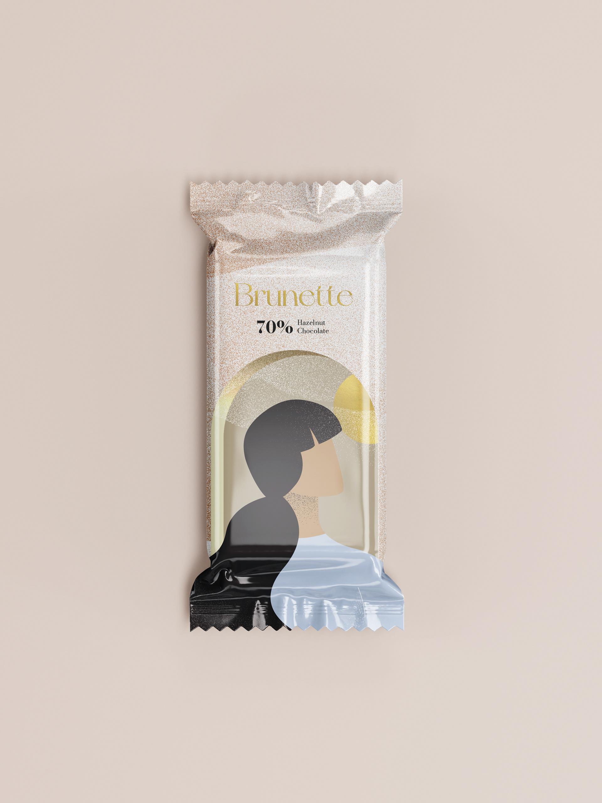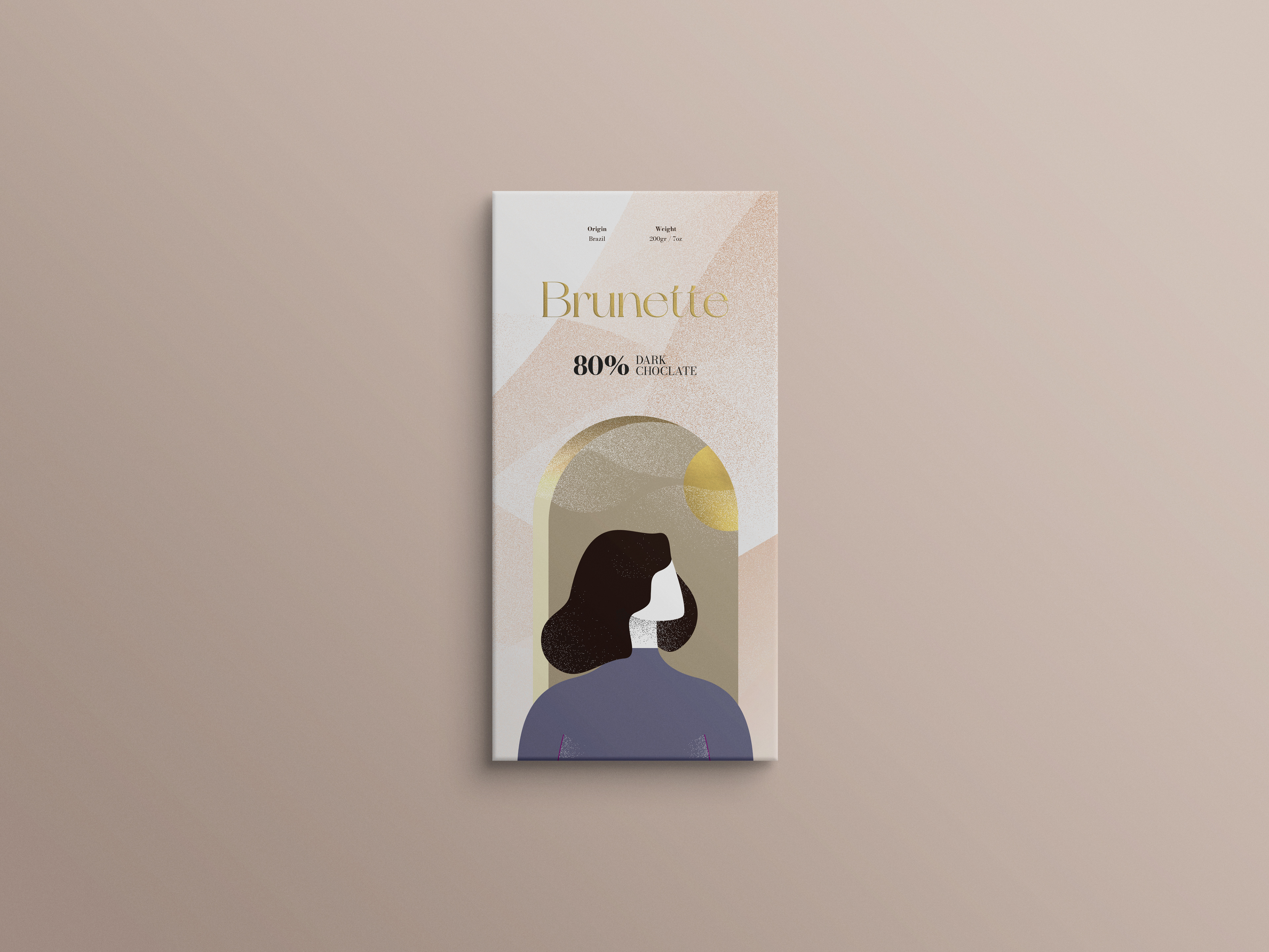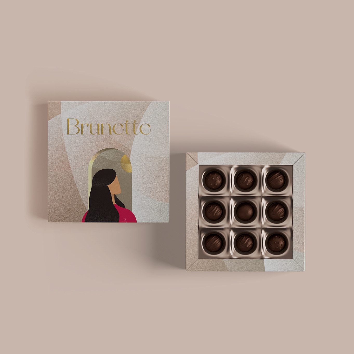 The “Brunette” chocolate brand embodies a sense of calm sophistication, featuring a brunette woman with different hairstyles peacefully gazing at the sunrise through an arch-shaped window on its packaging. This refined design evokes tranquility and introspection, highlighting the quiet joy and luxury of savoring fine chocolate. Each hairstyle variation symbolizes the brand’s diverse range of flavors and textures, appealing to individuality and personal indulgence. The brand’s vision is to create an intimate, visually captivating experience that resonates with customers, inviting them to pause, reflect, and savor their own peaceful moments with Brunette chocolate.