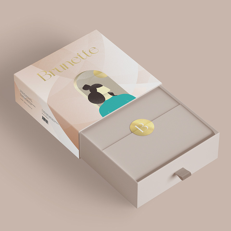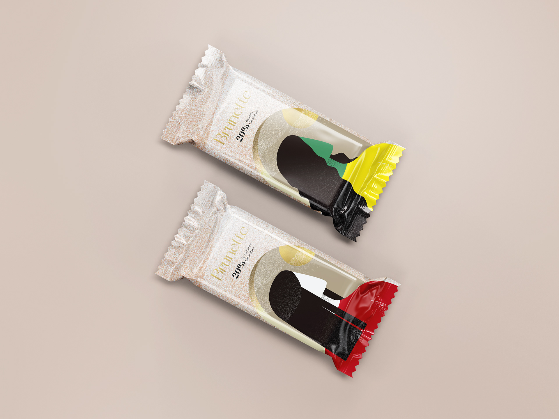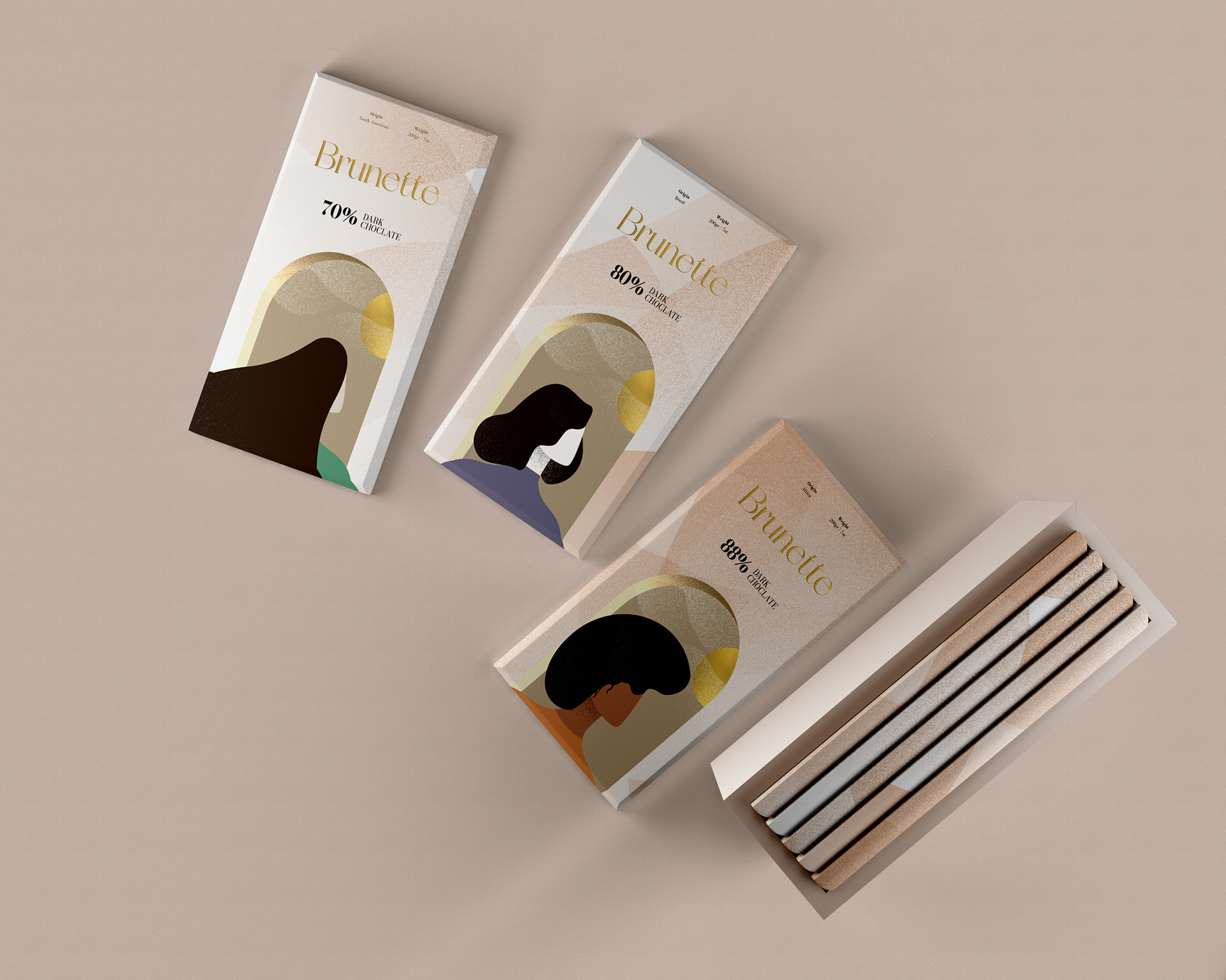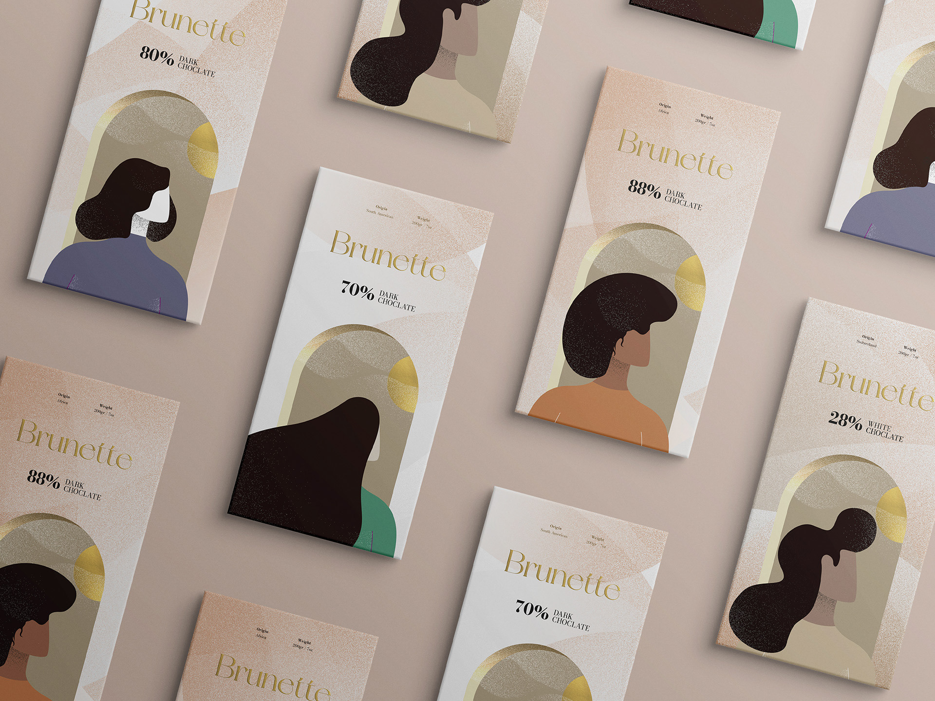 The “Brunette” chocolate brand embodies a sense of calm sophistication, featuring a brunette woman with different hairstyles peacefully gazing at the sunrise through an arch-shaped window on its packaging. This refined design evokes tranquility and introspection, highlighting the quiet joy and luxury of savoring fine chocolate. Each hairstyle variation symbolizes the brand’s diverse range of flavors and textures, appealing to individuality and personal indulgence. The brand’s vision is to create an intimate, visually captivating experience that resonates with customers, inviting them to pause, reflect, and savor their own peaceful moments with Brunette chocolate.