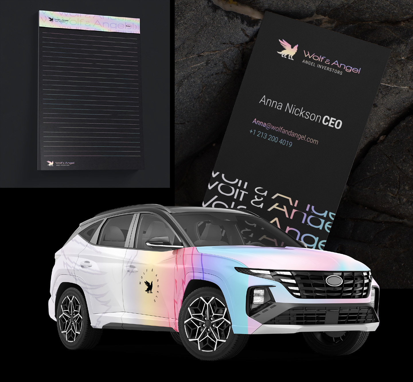 The Wolf & Angel brand identity design project aims to create a magical and enchanting visual representation for an angel investment company. Through holographic design elements, the brand identity will captivate audiences, evoke a sense of wonder, and reinforce the company's strategic positioning. By leveraging holographic effects, the design will communicate the convergence of technology, innovation, and celestial guidance, establishing Wolf & Angel as a visionary partner in the world of angel investing.